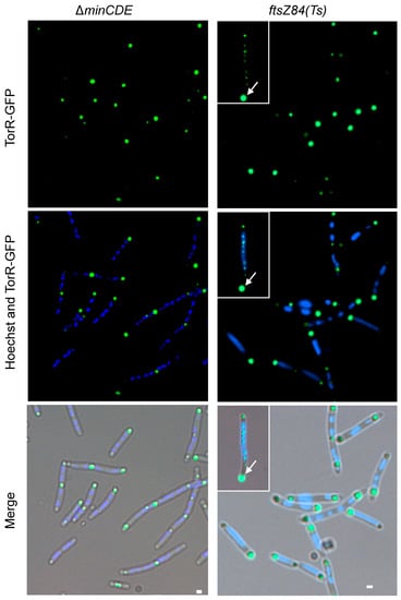 The FtsZ protein is an essential cell division protein which polymerizes to form a ring-structure, and the ring sets the site of division and serves as a scaffold for recruitment of other division proteins []. The placement and timing of the FtsZ ring assembly is a highly-regulated process. The MinCDE proteins ensure that the FtsZ ring, and hence the septum, is formed at mid-cell [] by oscillating from pole-to-pole []. To see if MinCDE or FtsZ affect the polar localization of TorR, W3110ΔtorRminCDE cells containing pTorR-GFP were exponentially grown at 37 °C. W3110ΔtorRftsZ84 (Ts) cells harboring pTorR-GFP grown at 30 °C were shifted up to the nonpermissive temperature (42 °C) to inactivate the thermosensitive FtsZ84 protein for 2 h. Then, the distribution patterns of TorR-GFP focus or foci were investigated through fluorescence microscopy. In the absence of the MinCDE proteins, the cells were elongated and two to five TorR-GFP foci were observed along the long axis of the cells. The TorR-GFP foci were almost even in size (Figure 6), suggesting that deletion of MinCDE allows for the formation of several TorR-GFP foci in a cell. Interestingly, inactivation of the FtsZ84 mutant protein led to formation of many TorR-GFP foci which were uneven in size in the elongated cells, and the TorR-GFP focus at the cell pole was likely growing stronger as a function of time at the non-permissive temperature (Figure 6). The elongated cells with many ‘abnormal’ TorR foci (Figure 6) accounted for 22% of the cells scored whereas cells with only one focus or cells with two foci (one big at one pole and one tiny at the other pole) (Figure 6) accounted for 78% of the cells scored. It seems that the absence of FtsZ does not affect delivery of TorR to the pole but it affects the formation of ‘normal’ TorR foci. It should be noted that TorR was not found to interact with FtsZ in either the pull-down or bacterial two-hybrid experiments. It is likely that the assembly of FtsZ-ring is a signal for formation of a TorR-GFP focus since several ‘normal’ TorR foci formed in the ∆minCDE cells where the several FtsZ-rings can be assembled [], but new ‘normal’ TorR focus did not appear when the FtsZ-ring cannot be formed due to inactivation of FtsZ84.