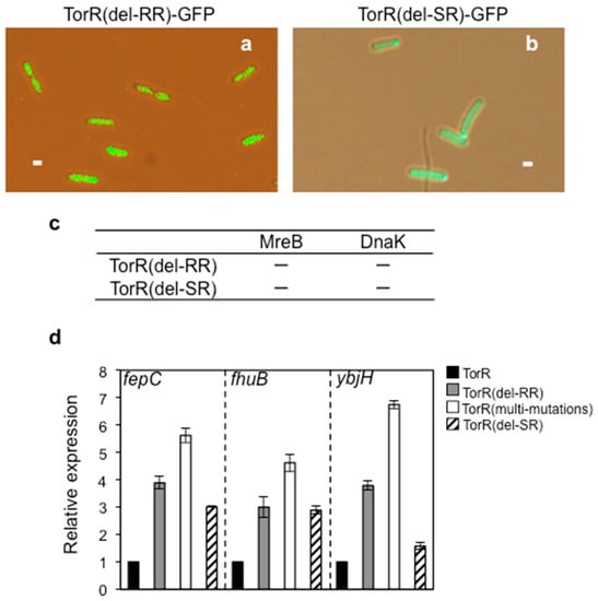 Deletion of the response regulator (RR) or signal receiver (SR) domain in the TorR protein abolishes its polymerization, polar localization and regulatory function on gene expression. (a) The RR domain of TorR was deleted in pTorR-GFP by site-directed mutagenesis kit, resulting in pTorR(del-RR)-GFP plasmid. Exponentially growing W3110ΔtorR/pTorR(del-RR)-GFP cells in ABTGcasa with IPTG for expression of TorR(del-RR)-GFP were collected and TorR(del-RR)-GFP in the cells was visualized; (b) Deletion of the SR domain of TorR in pTorR-GFP and visualization of TorR(del-SR)-GFP were as described in the legend to (a); (c) Interaction of mutant TorR with MreB or DnaK was detected by the bacterial two hybrid system. The pKNT-torR(del-RR) and pUT-mreB plasmids were used to test for TorR(del-RR)-MreB interaction, pKNT-torR(del-RR) and pUT-dnaK for TorR(del-RR)-DnaK, pKNT-torR(del-SR) and pUT-mreB for TorR(del-SR)-MreB, pKNT-torR(del-SR) and pUT-dnaK for TorR(del-SR)-DnaK—represents no protein–protein interaction as shown (white colonies) in Figure S7; (d) Expressions of the fepC, fhuB and ybjH genes in synchronized W3110ΔtorRdnaC2/pTorR(del-RR)-GFP, W3110ΔtorRdnaC2R/pTorR(del-SR)-GFP, or W3110ΔtorRdnaC2/pTorR(multi-mutations)-GFP cells in ABTGcasa were measured by RT-qPCR as described in the legend of Figure 3. The cells were synchronized and sampled at the 45 min time point as mentioned in the legend to Figure 2. The tested genes and mutated TorR-GFP fusions are as indicated. The values are the average of three individual experiments and the standard errors are given as the error bars.