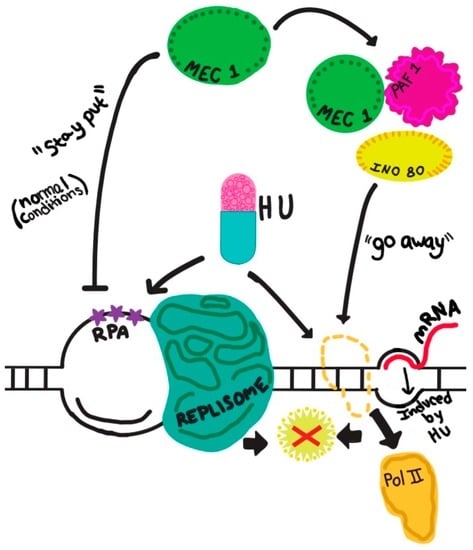 How does RNA processing play a role in damage sensing of a checkpoint response? It was recently shown that the RNA decay factors in yeast—Xrn1, Rrp6, and Trf4—are important for DSB-sensing as they promote the formation of RPA-ssDNA []. The precise function of these RNA processing factors at the damaged DNA site is unknown. Clearing the DNA template for possible DNA:RNA hybrid molecules—also known as the co-transcriptional R loops—does not appear to be the reason, because increased production of RNase H1 (which degrades DNA:RNA hybrids) does not promote RPA-ssDNA formation in the absence of Rrp6 or Trf4 []. However, this result does not exclude the possibility that RNA molecules in contexts other than DNA:RNA hybrid might be responsible for the blockage of RPA-ssDNA formation. For instance, an aberrant mRNP (messenger ribonucleoprotein) particle may be obstructing the damaged site. This hypothesis is substantiated by recent findings that Rrp6 plays an important role in the quality control of specific mRNPs [,]. Moreover, a previous proteomic analysis revealed a multitude of interactions between RPA and the chromatin remodeling proteins, including Ino80, Isw1, Isw2, Swic, Rsc2, and SWI/SNF []. The question then becomes “do these proteins play a role in promoting RPA-ssDNA formation at the damaged fork?” Indeed, there has been some evidence suggesting that in mammalian cells, chromatin remodeling factors such as INO80 facilitate RPA-ssDNA formation during DSB processing [,]. Finally, it would also be interesting to determine if RNA processing plays a role in the detection of RPA-ssDNA in the context of a stalled fork.