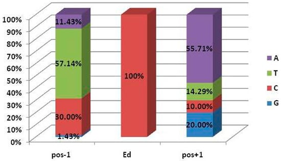 Nucleotide context of editing sites in Ae. tauschii (AL8/78). pos −1 and pos +1 indicate the direct upstream and downstream nucleotide of the edited sites (Ed).