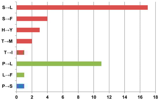 It has been demonstrated that the editing sites in the chloroplasts of seed plants preferred 5′-T–A-3′ flanking bases and/or a 5′-pyrimidine due to the genomic context with lower substitution rates [,,]. Thus, we further analyzed the flanking bases of all 70 editing sites identified via the bioinformatics prediction and RNA-Seq data. Results revealed that 31.43% (22 of 70) of sites showed a tCa bias and 81.43% (57 of 70) possessed tCn or nCa trinucleotides (Figure 1). Additionally, a 5′-pyrimidine was observed in 61 sites, accounting for 87.14%, of which thymine accounted for 57.14% and cytosine accounted for 30.00%. Furthermore, all the editing events in the protein-coding genes could result in eight types of amino acid transitions (Figure 2). Among them, 27 out of 40 editing events (67.5%) led to a conversion from hydrophilic amino acid to hydrophobic amino acid (Figure 2, red bar), with only one changing from hydrophobic amino acid to hydrophilic amino acid (P→S) (Figure 2, blue bar), and the remaining 12 without hydrophobicity exchanges (Figure 2, green bar). Moreover, most of the amino acid conversions affected by RNA editing were serine to leucine (17), followed by proline to leucine (11). This was most likely due to serine being encoded by tCn and proline by the cCn codon. The low re-mutation biased genomic context could result in the conservative (functionally similar) amino acid exchange, probably without negative effects on protein function [].