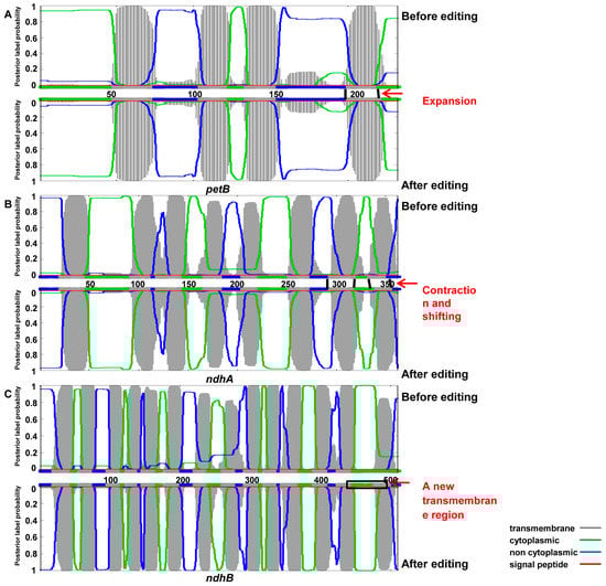 Transmembrane topology of petB, ndhA and ndhB before and after editing. (A) The transmembrane region of petB expanded to the C terminal of the protein after editing; (B) The transmembrane region of ndhA displayed a contraction and shift after editing; (C) NdhB showed a larger transmembrane region after editing.