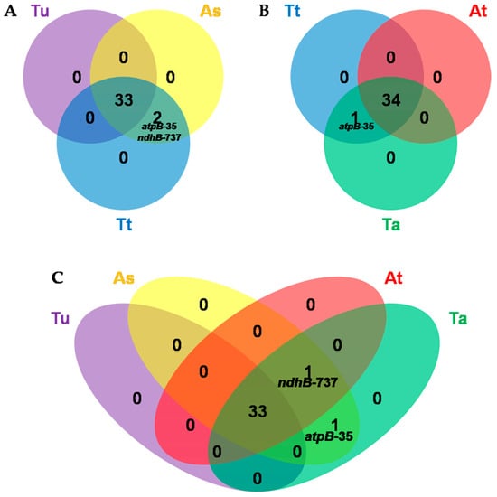 Comparison of RNA editing sites in chloroplast genes of T. aestivum and its genome donors. (A) Comparison among T. urartu, Ae. speltoides and T. turgidum; (B) Comparison among T. turgidum, Ae. tauschii and T. aestivum; (C) Comparison among T. urartu, Ae. speltoides, Ae. tauschii and T. aestivum. Tu indicates T. urartu (PI428335); As indicates Ae. speltoides (AE918, TA1796 and PI487232); At indicates Ae. tauschii (AL8/78); Tt indicates T. turgidum ssp. dicoccoides (TA0073, TA0060 and TA1133); and Ta indicates T. aestivum cv CS (TA3008). T. urartu, Triticum urartu L. Ae. speltoides, Aegilops speltoides L. T. turgidum, Triticum turgidum L. Ae. tauschii, Aegilops tauschii L. T. aestivum, Triticum aestivum L.