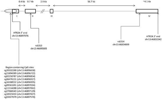 HTR2A gene structure showing exons, loci of rs6313 and rs6314, and all 10 selected CpG sites.