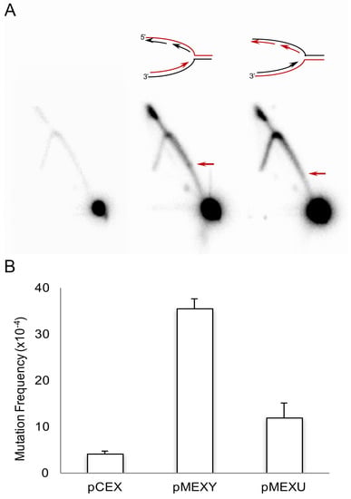 There are many reports demonstrating that non-B DNA can cause replication fork stalling [,,,,,,,], which can result in replication fork collapse, and the formation of DNA double-strand breaks (DSBs), and subsequent genetic instability [,,]. We have discovered that a short 34 bp H-DNA-forming sequence from the human c-MYC promoter, near one of the translocation hotspots found in Burkitt lymphoma, was mutagenic on reporter plasmids in human cells and on chromosomes in mouse genomes via both replication-dependent and replication-independent mechanisms [,,]. We found that this repetitive element stalled DNA replication fork progression in mammalian cells, and also stimulated the formation of DSBs and mutations in the presence or absence of DNA replication []. Using the same approach, we report here that the orientation of this polypurine-polypyrimidine mirror repeat plays an important role in replication stalling and mutation in mammalian cells in a replication orientation-dependent fashion (Figure 2). The same repeat was inserted at the same location on the mutation-reporter plasmid, but in opposite directions, i.e., the purine-rich strand served as the template for lagging strand synthesis in pMEXY, and the pyrimidine-rich strand was used for lagging strand synthesis in pMEXU. The plasmids (pMEXY, pMEXU and control B-DNA-forming pCEX) were transfected into mammalian COS-7 cells, and replication intermediates were recovered 24 h later and subjected to 2-D electrophoresis of DNA replication intermediates as previously described [,,]. The results revealed a typical Y-shape replication arc because the SV40 origin was not included in the probed area. As shown in Figure 2A, DNA replication was stalled at the H-DNA region in the pMEXY plasmid and resulted in bulges on the right arm of the arc, and a much lighter left arm, suggesting fewer replication intermediates past the H-DNA sequence compared to that in pMEXU. Notably, the replication stalling on the pMEXU plasmid was not as obvious as that on pMEXY, suggesting a stronger impact on DNA replication when the purine-rich strand was on the lagging strand. Consistently, H-DNA-forming sequences induced higher mutation frequencies than control B-DNA sequences in the same reporter plasmids 48 h after transfection into mammalian COS-7 cells, and pMEXY stimulated higher mutation frequencies than pMEXU (Figure 2B). This result provided evidence for a role of non-B DNA-induced replication fork stalling in DNA-structure-induced genetic instability in mammalian cells.