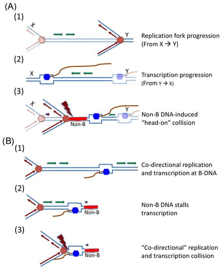 In both prokaryotic and eukaryotic cells, transcription and replication are carefully organized, regulated, and timed. In prokaryotic genomes DNA replication is initiated at a single origin, and the highly expressed genes and essential genes are located on the template for leading strand synthesis, thus replication and transcription progress in the same direction. Thus, “head-on” collisions at these important genes are largely avoided. Transcription itself does not appear to affect DNA replication elongation when the two processes occur in a co-directional orientation or do not exist in close proximity []. In eukaryotic genomes, both transcription and replication start from multiple sites and replication forks move in both directions in the genome, so DNA and RNA polymerases have the risk of competing for the same DNA template if not properly regulated. Because non-B DNA conformations may affect the initiation and timing of both replication and transcription, and stall the elongation process, it is possible that non-B DNA-forming elements could cause “traffic congestion” on the DNA template and increase the chance of collision, leading to genetic instability. Inappropriate initiation or elongation of either replication or transcription could lead to head-on or co-directional collisions, as illustrated in Figure 3.