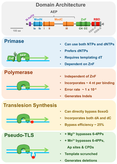 - Guilliam, T.A.; Jozwiakowski, S.K.; Ehlinger, A.; Barnes, R.P.; Rudd, S.G.; Bailey, L.J.; Skehel, J.M.; Eckert, K.A.; Chazin, W.J.; Doherty, A.J. Human PrimPol is a highly error-prone polymerase regulated by single-stranded DNA binding proteins. Nucleic Acids Res. 2015, 43, 1056–1068. [Google Scholar] [CrossRef] [PubMed]