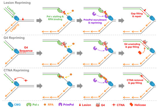 Repriming roles of PrimPol in nuclear DNA replication. PrimPol is able to reprime and reinitiate leading strand replication downstream of a range of replicase stalling obstacles. Here, the ability of PrimPol to reprime downstream of DNA lesions, G4 secondary structures, and chain-terminating nucleotide analogues, is highlighted. Following repriming, replication can proceed and the resulting single-stranded DNA (ssDNA) gap is filled through translesion synthesis (TLS) or template switching mechanisms, permitting subsequent repair or removal of the obstacle. Only the CDC45, MCM, GINS (CMG) complex, Pol ε, PrimPol, and RPA, are shown for simplicity. A key for identifying each factor is shown below. CTNA: chain-terminating nucleoside analogues.