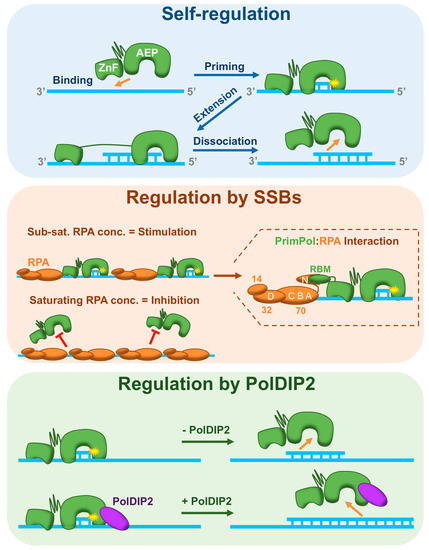 The ability of primases to bind and prime on ssDNA gives them the potential to facilitate unscheduled priming in vivo, wherever ssDNA is available. Despite limiting the synthesis of long DNA tracts, PrimPol’s self-regulatory mechanisms do not restrict where it can prime. Dysregulated priming is potentially highly detrimental to the cell, as these primers could be extended by other Pols. To prevent this, PrimPol is also regulated by RPA and mtSSB (Figure 3, middle panel). Both of these SSBs stimulate the activity of their respective replicative Pols, δ and γ [113,114]. In contrast, both RPA and mtSSB severely restrict the polymerase activity of PrimPol [55]. Additionally, these SSBs can also inhibit primase activity, as is the case with Pol α-primase [55,115]. More recently, it was reported that RPA’s effect on PrimPol’s primase activity is highly concentration-dependent. In fact, sub-saturating concentrations of RPA dramatically stimulate primer synthesis but inhibition occurs as the concentration increases [104].