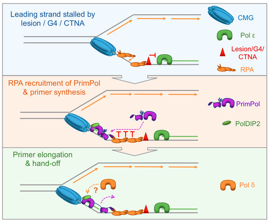 Recent reports strongly indicate that PrimPol is recruited by RPA to the leading strand, following replicase stalling, in order to reprime replication and prevent genome instability. However, PrimPol is an error-prone enzyme and unscheduled or dysregulated activity could lead to mutagenesis [55]. In this section, we will discuss our current understanding of the mechanisms used to limit PrimPol’s contribution to DNA synthesis during replication (Figure 3).