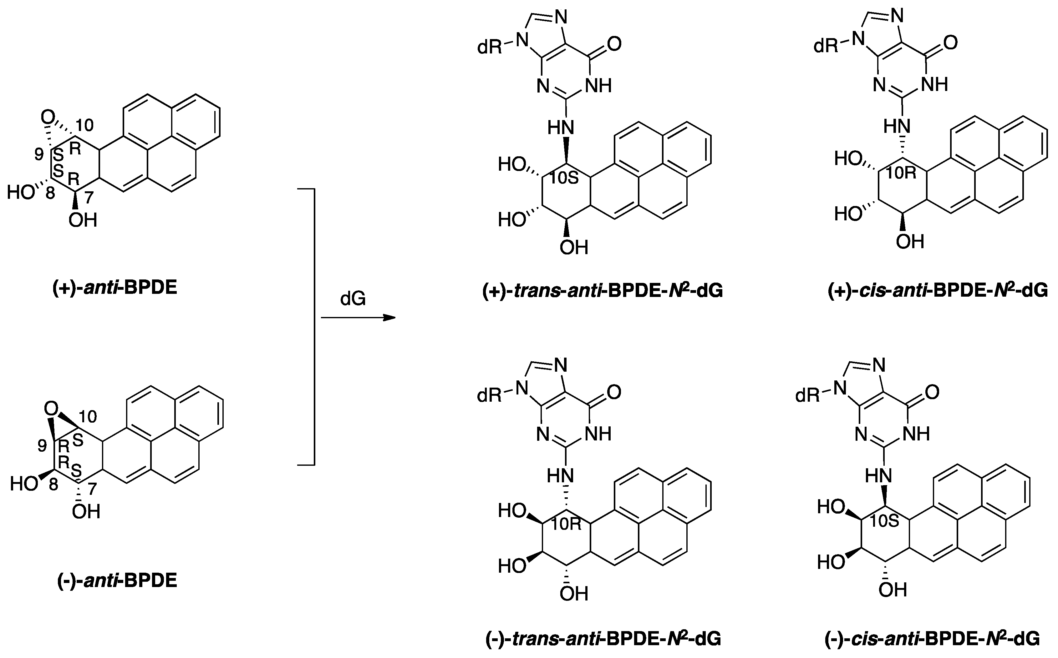- Cheng, S.C.; Hilton, B.D.; Roman, J.M.; Dipple, A. DNA adducts from carcinogenic and noncarcinogenic enantiomers of benzo[a]pyrenedihydrodiol epoxide. Chem. Res. Toxicol. 1989, 2, 334–340. [Google Scholar] [CrossRef] [PubMed]