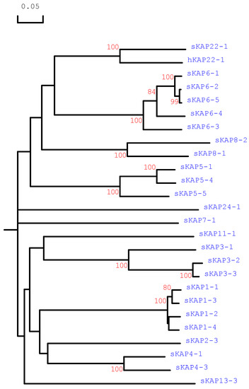 Phylogenetic tree of the sheep genomic regions identified, together with human KAP22-1. The tree was constructed using the predicted amino acid sequences. The ovine KAPs are indicated with the prefix “s” and the human KAP has the prefix “h”. The numbers at the forks indicate the bootstrap confidence values and only those equal to or higher than 70% are shown. The GenBank accession numbers for the human KAP22-1 is AP001708. The GenBank accession numbers for the sheep KAPs are X01610, HQ897973, X02925, X01610, U60024, M21099, M21100, M21103, X73462, EU239778, X55294, X73434, X73435, M95719, KT725827, KT725833, KT725838, KT725841, X05638, X05639, KF220646, HQ595347, JN377429 and JX112014 (for sKAP1-1, sKAP1-2, sKAP1-3, sKAP1-4, sKAP2-3, sKAP3-1, sKAP3-2, sKAP3-3, sKAP4-1, sKAP4-3, sKAP5-1, sKAP5-4, sKAP5-5, sKAP6-1, sKAP6-2, sKAP6-3, sKAP6-4, sKAP6-5, sKAP7-1, sKAP8-1, sKAP8-2, sKAP11-1, sKAP13-3 and sKAP24-1, respectively).
