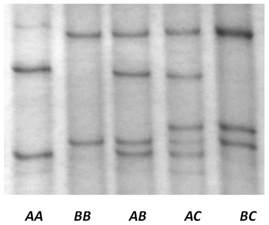 The PCR amplicons were screened for sequence variation using SSCP analysis. A 0.7-μL aliquot of each amplicon was mixed with 7 μL of loading dye (98% formamide, 10 mM EDTA, 0.025% bromophenol blue, 0.025% xylene-cyanol). After denaturation at 95 °C for 5 min, the samples were rapidly cooled on wet ice and then loaded on 16 cm × 18 cm, 14% acrylamide: bisacrylamide (37.5:1) (Bio-Rad) gels. Electrophoresis was performed using Protean II xi cells (Bio-Rad) in 0.5× TBE buffer, under the electrophoretic conditions 18 °C, 300 V for 16 h. Gels were silver-stained according to the method of Byun et al. [11].