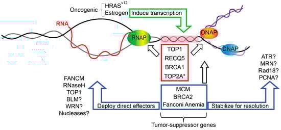 Figure 1. DNA replication fork protection factors mitigating transcription–replication conflicts. A nascent RNA (red) emerging from RNA polymerase (RNAP) annealed to its template could impede an incoming DNA replication fork (orange and blue polymerases (DNAP), right) to create a region of topological conflict (pink box, a replication–transcription collision). Fork protection factors with dual roles in transcription and replication (red box) or with roles at replication forks only (blue box) could act to suppress such conflicts either directly, as is the case for Fanconi anemia complementation group M (FANCM), RNaseH, and topoisomerase I (TOP1), or could act indirectly by stabilizing replication forks to allow time for canonical R-loop resolution mechanisms to act. Tumor suppressor gene mutations impact these fork protection mechanisms. Oncogenic mutations or stimuli also contribute to transcription-replication conflicts by inducing or creating aberrant transcriptional programs. * TOP2A was implicated indirectly in the cited study showing that p53 mutations increase transcription-replication conflicts [57].