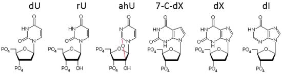 - Parikh, S.S.; Walcher, G.; Jones, G.D.; Slupphaug, G.; Krokan, H.E.; Blackburn, G.M.; Tainer, J.A. Uracil-DNA glycosylase-DNA substrate and product structures: Conformational strain promotes catalytic efficiency by coupled stereoelectronic effects. Proc. Natl. Acad. Sci. USA 2000, 97, 5083–5088. [Google Scholar] [CrossRef] [PubMed]