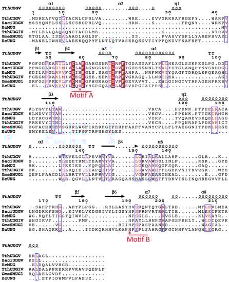 Structure-based sequence alignment of the UDG superfamily. Completely conserved residues among family 1–5 UDGs are boxed with solid lines. The location of the secondary structure elements of TthUDGV is represented at the top of sequences. The conserved motifs A and B are underlined by red lines, and the active residues are marked by red stars. Abbreviations: EcUNG, E. coli UNG; EcMUG, E. coli MUG; GmeSMUG, Geobacter metallireducens SMUG; TthUDGIV, T. thermophilus UDGIV; TthUDGV, T. thermophilus UDGV; and SacUDGV, S. acidocaldarius UDGV. The sequences of the five families’ UDGs were mutialigned using ClustalW and EXPript3.x.