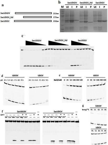 Uracil removal activities of SacUDGs. (a) Diagram of three UDGs from S. acidocaldarius; (b) 15% SDS-PAGE analysis of recombinant SacUDGs recovered from induced E. coli extracts. The gel was stained with Coomassie blue R-250. Lane M: molecular weight marker; lane UI: uninduced E. coli total proteins; lane I: induced E. coli total proteins; lanes P: purified recombinant protein; (c) Removal of dU from single-stranded DNA by SacUDGs. Approximately 300 ng SacUDGs were diluted in two-fold and incubated with 0.1 μM ss DNA for 15 min at 50 °C. Effect of pH value (d); NaCl concentration (e); divalent ions (f); and reaction temperature (g) on dU removal by SacUDGs. During optimization of reaction conditions about 1 ng SacUDGIV or 10 ng SacUDGV and 0.1 μM dU-carrying single-stranded DNA were incubated at 50 °C for 15 min in assay buffer with various pH value, ion strength, or divalent ions. The reactions were performed at different temperatures for 15 min in an optimal assay buffer.