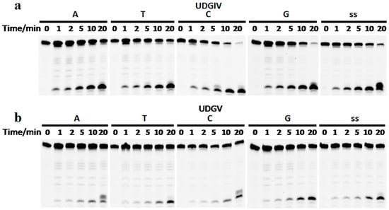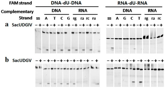 Effect of ribose and deoxyribose backbone on the removal of dU by SacUDGs. SacUDGIV (a) and SacUDGV (b) were incubated with 0.1 μM single-stranded (DNA-dU-DNA, RNA-dU-RNA) and double-stranded substrates (DNA-dU-DNA/DNA, DNA-dU-DNA/RNA, RNA-dU-RNA/DNA, and RNA-dU-RNA/DNA) at 50 °C for 10 min. After incubation, 10 mM NaOH (final concentration) was added to reaction and heated for 10 min at 95 °C to cleave the AP sites. The amount of each UDG is 2 ng (a), and 10 ng (b), respectively.