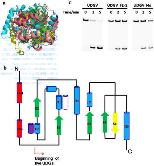Structural and sequence multialignment of family 1 to 5 UDGs. (a) Superimposition of five members from UDG superfamily. Each UDG is shown in yellow (TthUDGV, PDB ID: 2d3y), green (EcMUG, PDB ID: 1mug), cyans (EcUNG, PDB ID: 1eug), wheat (GmeSMUG, PDB ID: 5h98), and purple (TthUDGIV, PDB ID: 1ui0), respectively; (b) topology structure of UDG superfamily. The topology of each member of UDG superfamily shows a conserved and unique feature. The secondary-structure elements of the UDG fold are colored as following: common α helices are shown as blue cylinders (the white one is missing in family 1, and the purple one is missing in family 5), and β-strands as green arrows (the yellow one is specific to MUG). The red cylinders are specific to the N-terminal domains of UDGs, excluding the MUG family. (c) Effect of N-terminal helices and [4Fe-4S] on dU removal by SacUDGV.