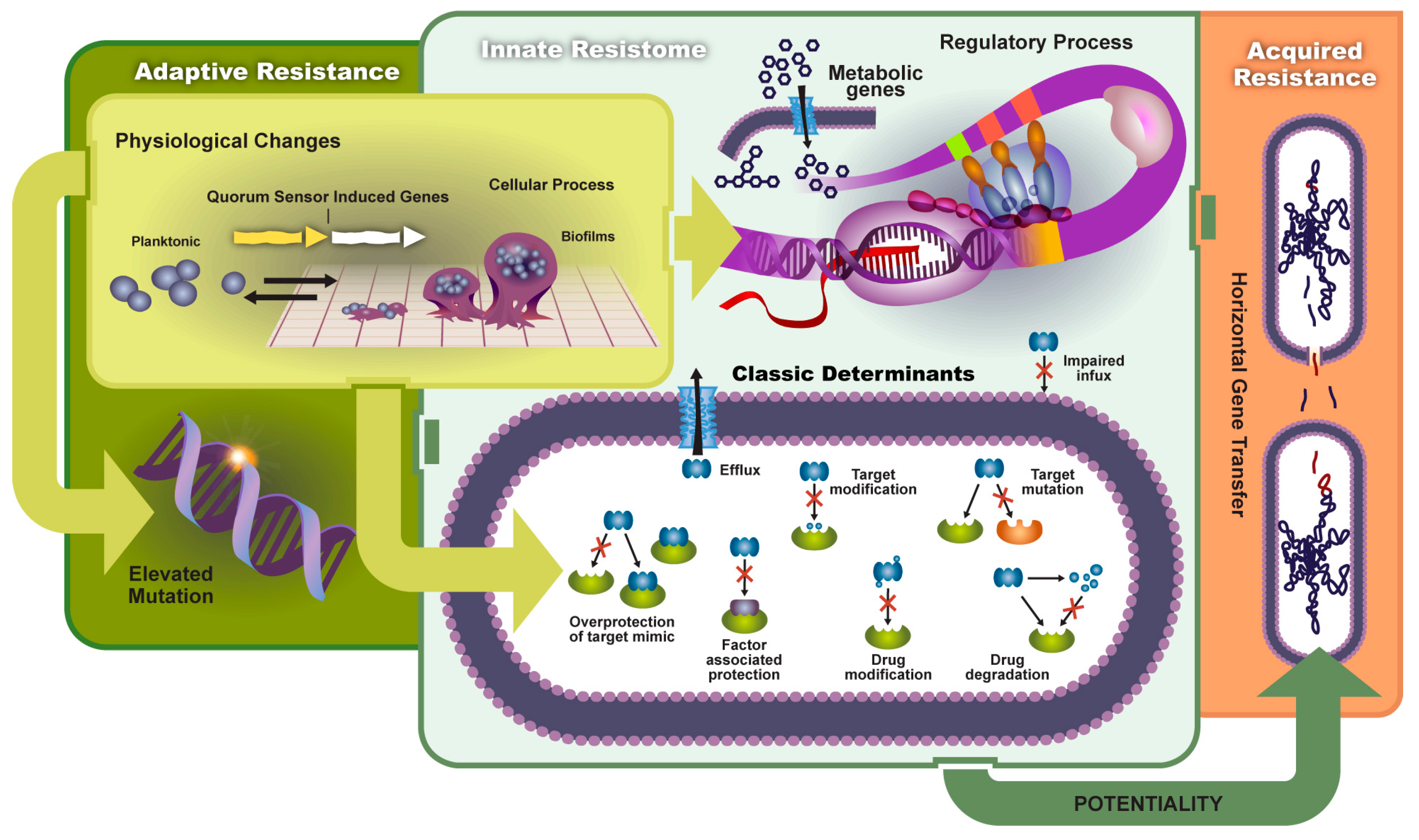 The transmission and mechanisms of antibiotic resistance and virulence can be divided into adaptive resistance, innate resistance, and acquired resistance. Environmental factors can prompt physiological changes and lead to: (1) elevated mutation rates; (2) changes in metabolic genes and regulatory processes; and (3) a host of classic antibiotic inactivation and resistance mechanisms (classic determinants). Such resistance and increased virulence can potentially be shared among bacteria leading to acquired resistance.
