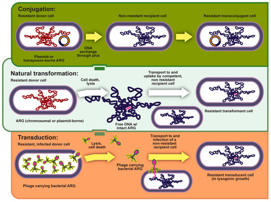 Horizontal gene transfer can commonly occur through conjugation and natural transformation. Additionally, it may occur through transduction, where resistance is transmitted via bacteriophage.