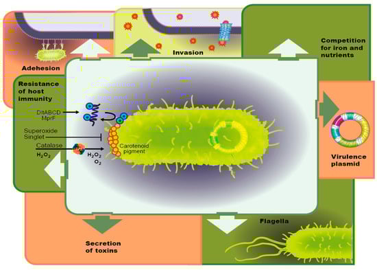 Plasmids are an adaption bacteria utilize to transfer genetic material between bacteria of the same species, as well as between different bacterial species. Many plasmids in pathogenic bacteria only encode virulence genes, antibiotic resistance genes, or genes required to activate virulence genes on the chromosome. Shiga-toxin producing E. coli (STEC) are associated with food borne illness. One of the most important serotypes, O157:H7, possesses a large virulence plasmid—pO157. This highly studied plasmid is believed to encode the virulence genes ehxA (enterohemolysin) [137], etpC to etpO (Type II Secretion System) [138], espP (serine protease) [139], katP (catalase-peroxidase) [139], toxB (a potential adhesion) [140], stcE (zinc metalloprotease) [141], and ecf (eae conserved fragment) [142] (For a review, see [143]). One study investigated 22 STEC and 4 non STEC strains, isolated from humans, pigs, and a variety of other environmental samples, comparing whole genome sequences to identify virulence and novel antibiotic resistance plasmids. A total of 39 novel plasmids were identified, many of them contained virulence genes from pathogenic E. coli groups, including STEC. In addition, 8 of these plasmids contained 29 antibiotic resistance genes encoding resistance to these major antibiotic groups: aminoglycosides, carbapenems, penicillins, cephalosporins, chloramphenicol, dihydrofolate reductase inhibitors, sulfonamides, tetracyclines and resistance to heavy metals. Broad-spectrum antibiotic resistance could be conferred because many of the plasmids contained more than one antibiotic resistance gene. This study showed that virulence plasmids can be found in many E. coli strains or serotypes, which were isolated from diverse locations, demonstrating that plasmids with multiple virulence and antibiotic resistance genes can be easily spread amongst the E. coli species [144].