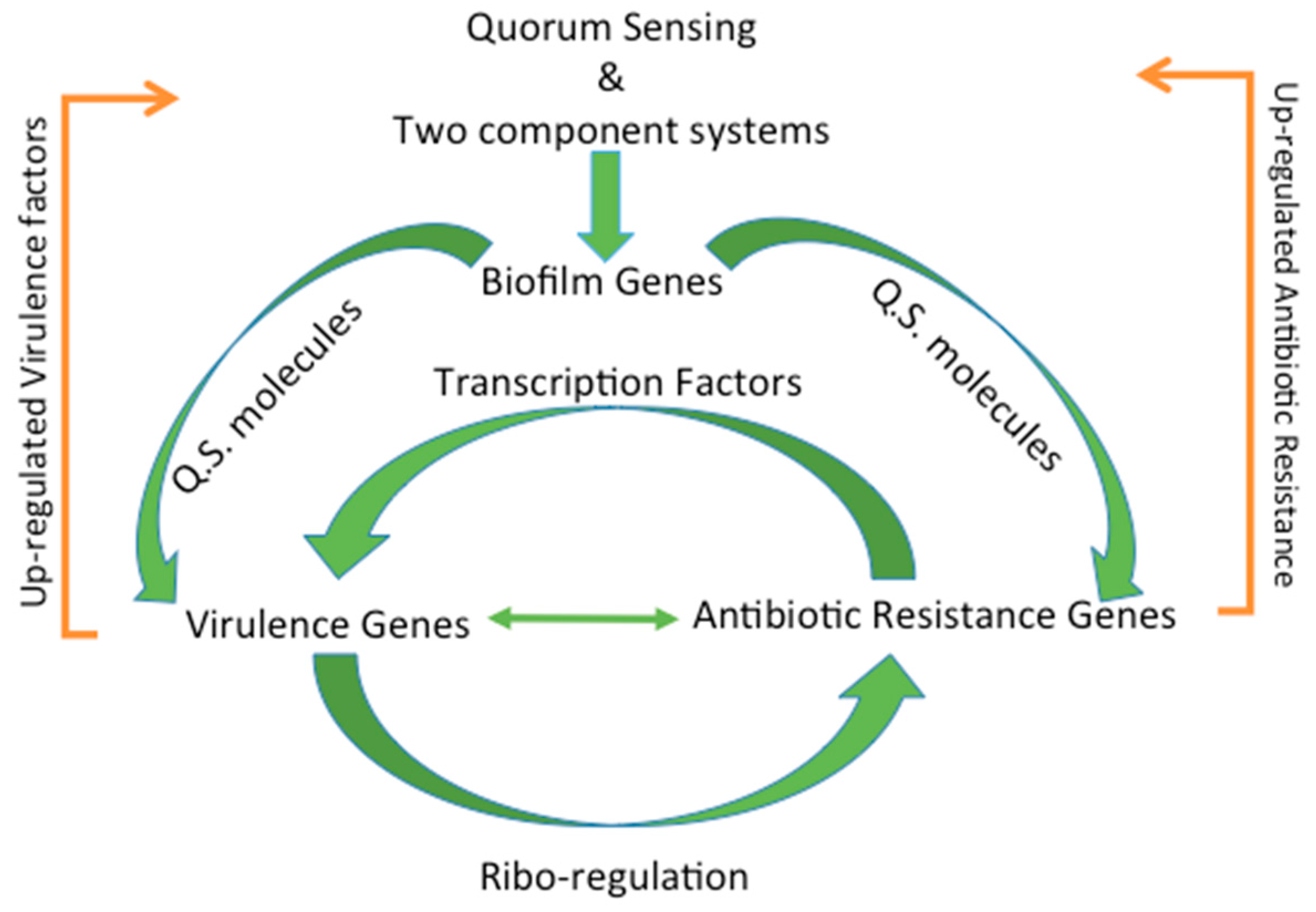 Common regulatory mechanisms act as a connection between virulence and antibiotic resistance. Quorum sensing and two component systems upregulate biofilm genes, which in turn upregulate quorum sensing molecules that in turn influence virulence and antibiotic resistance genes. Up-regulated virulence and antibiotic resistance genes serve to upregulate quorum sensing and two component systems and complete the cycle.