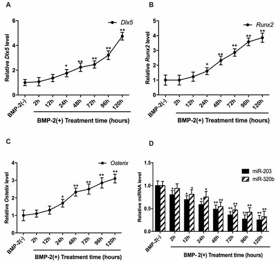 Time course for the expression of Dlx5, Runx2, Osx and miR-203 and miR-320b. The time course shows an increase in the relative expression levels of: Dlx5 (A); Runx2 (B); and Osx (C) at the mRNA level in BMP-2 induced cells. A concomitant decrease in the miR-203 and miR-320b expression levels is seen in the cells treated with BMP-2 (D). Expression levels in cells untreated with BMP-2 were set to 1. All values are represented as mean ± S.D. of three independent experiments. Statistical significance is indicated as * p < 0.05 and ** p < 0.001.