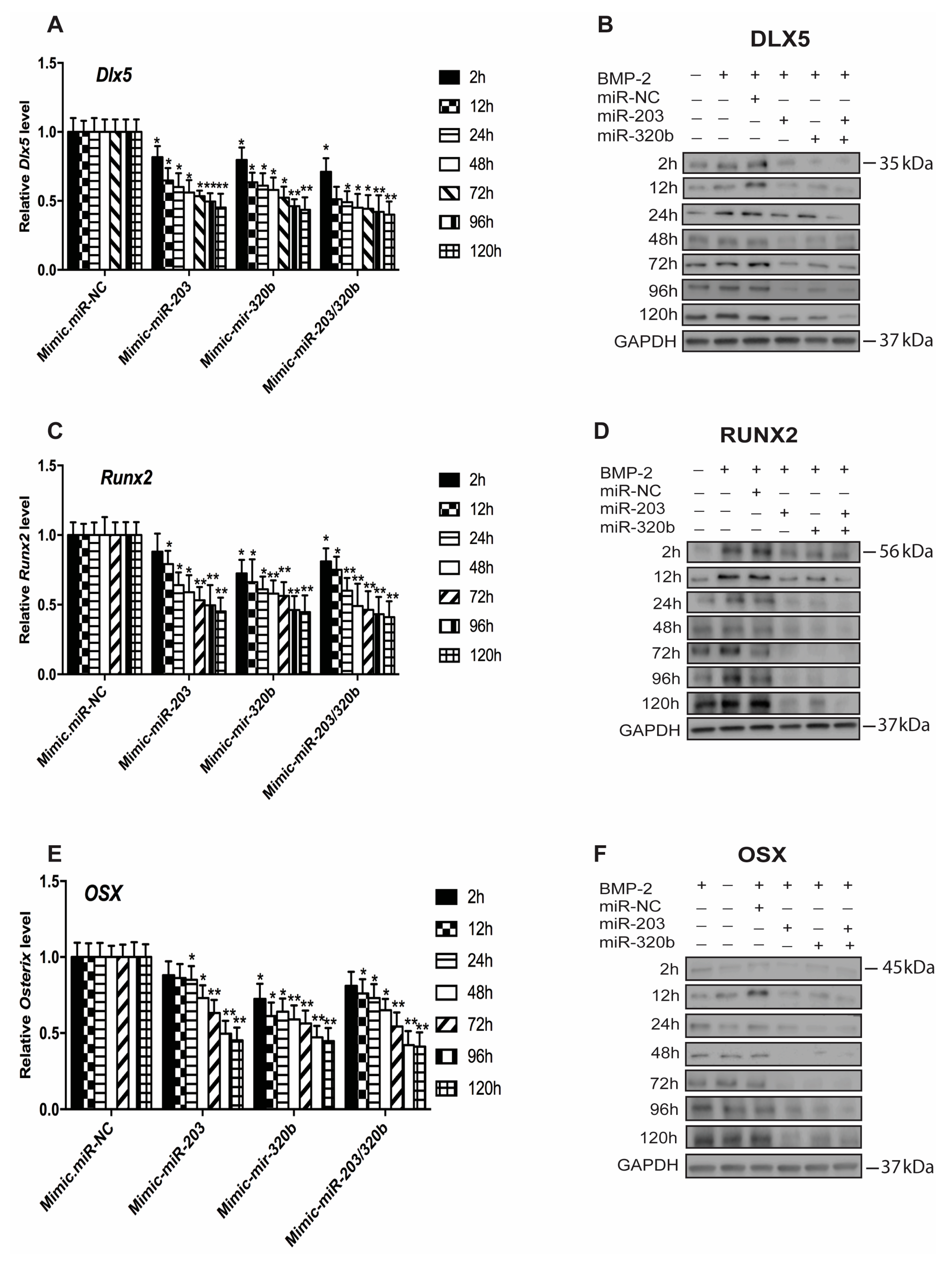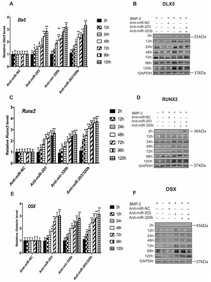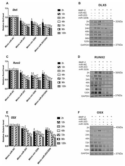 To verify experimentally if the putative binding sites of miR-203 and miR-320b were functional and to evaluate the role of miR-203 and miR-320b on osteoblast differentiation stimulated by BMP-2, HOBs were transfected with miR-203 and miR-320b mimic, anti-miR and NC. mRNA and protein levels were assessed at set time points using qPCR and Western blotting. miRNAs were overexpressed by transfecting HOBs with either miR-203 or miR-320b mimics or both, showing that endogenously expressed miRNA significantly reduced the expression of Dlx5 (Figure 3A,B). A concurrent decrease in the levels of Runx2 (Figure 3C,D) and Osx (Figure 3E,F) at the mRNA and protein levels up to 120 h when compared to cells treated with mimic NC was also observed.