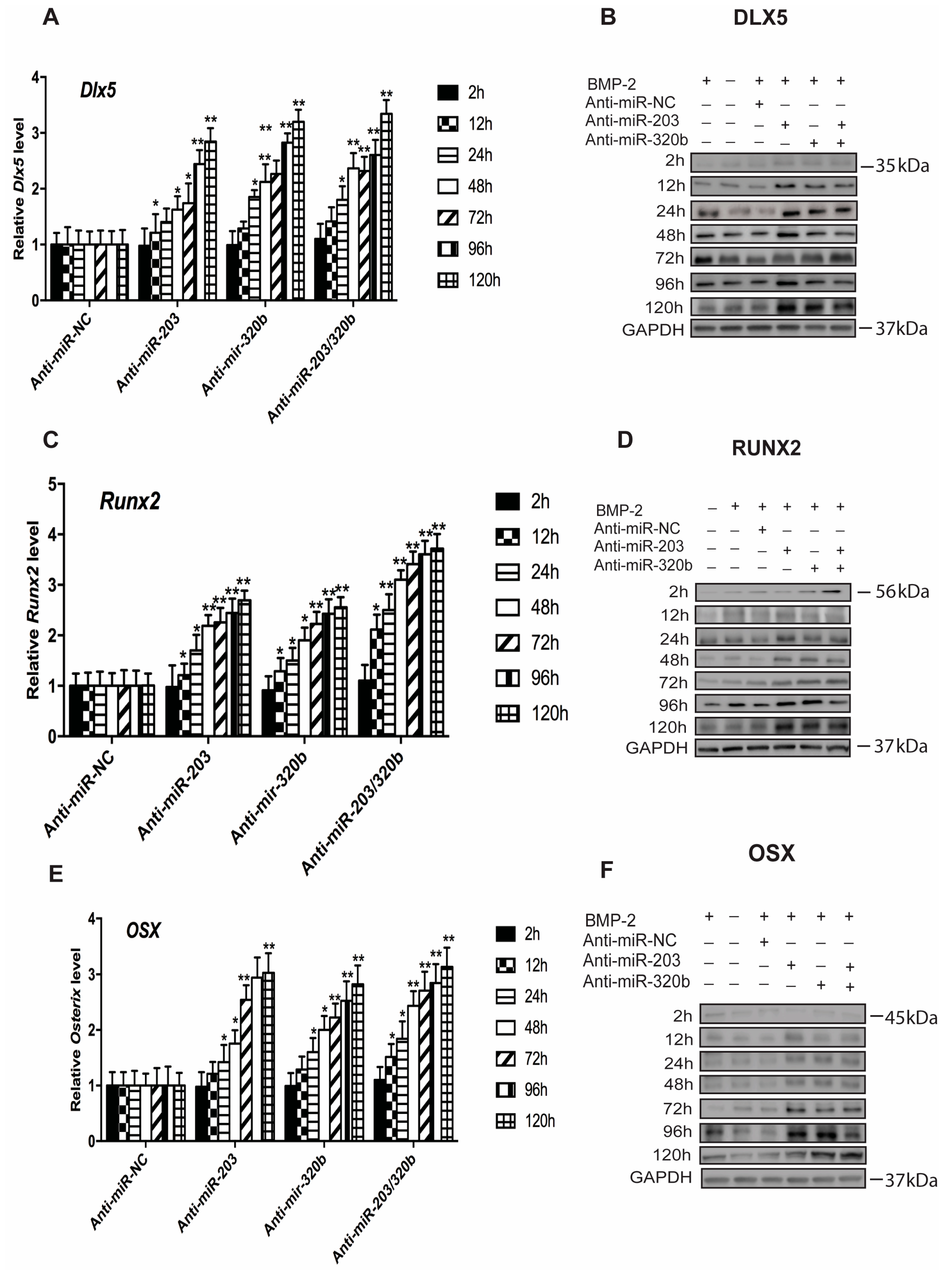 Conversely, the expression of either miR-203 or miR-320b or both was repressed using anti-miR, to assess if miRNA repression regulated osteoblast differentiation. Dlx5 expression was significantly increased (Figure 4A,B), and also observed was a concurrent increase in the levels of Runx2 (Figure 4C,D) and Osx (Figure 4E,F) at the mRNA and protein levels up to 120 h when compared to cells treated with anti-miR NC. GAPDH was used as an internal control for the Western blots. GAPDH for only one time point (120 h) is shown as the representative blot for all the time points. GAPDH levels for the rest of the time points are similar. All these results suggest that miR-203 and miR-320b negatively regulates Dlx5 expression at translational level in BMP-2 stimulated osteoblast differentiation, and in turn regulates Runx2 and Osx expression.