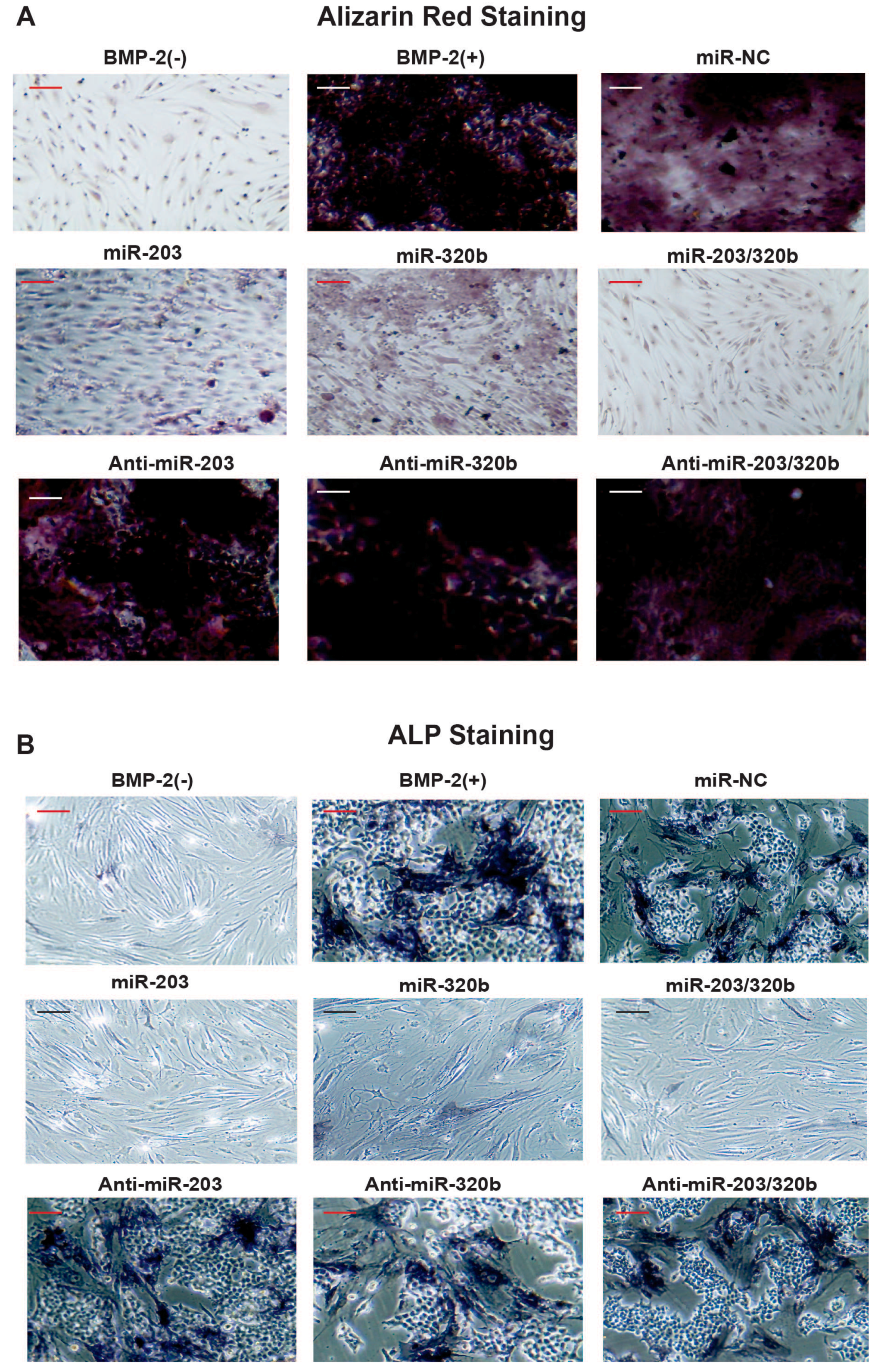 To study the impact of miR-203 and miR-320b on BMP-2 stimulated differentiation of human osteoblast, HOBs were transfected with either pre-miR or anti-miR. The osteoblast differentiation marker ALP expression was significantly enhanced with the inhibition of miR-203 and miR-320b after BMP-2 treatment compared to no BMP-2 treatment and NC, and in vitro matrix mineralization was visualized by Alizarin red staining. In contrast, HOBs transfected with pre-miR miR-203 and miR-320b, the ALP activity and matrix mineralization was reduced (Figure 5A,B). Taken together, these results suggest that miR-203 and miR-320b act as negative regulators of osteoblast differentiation.