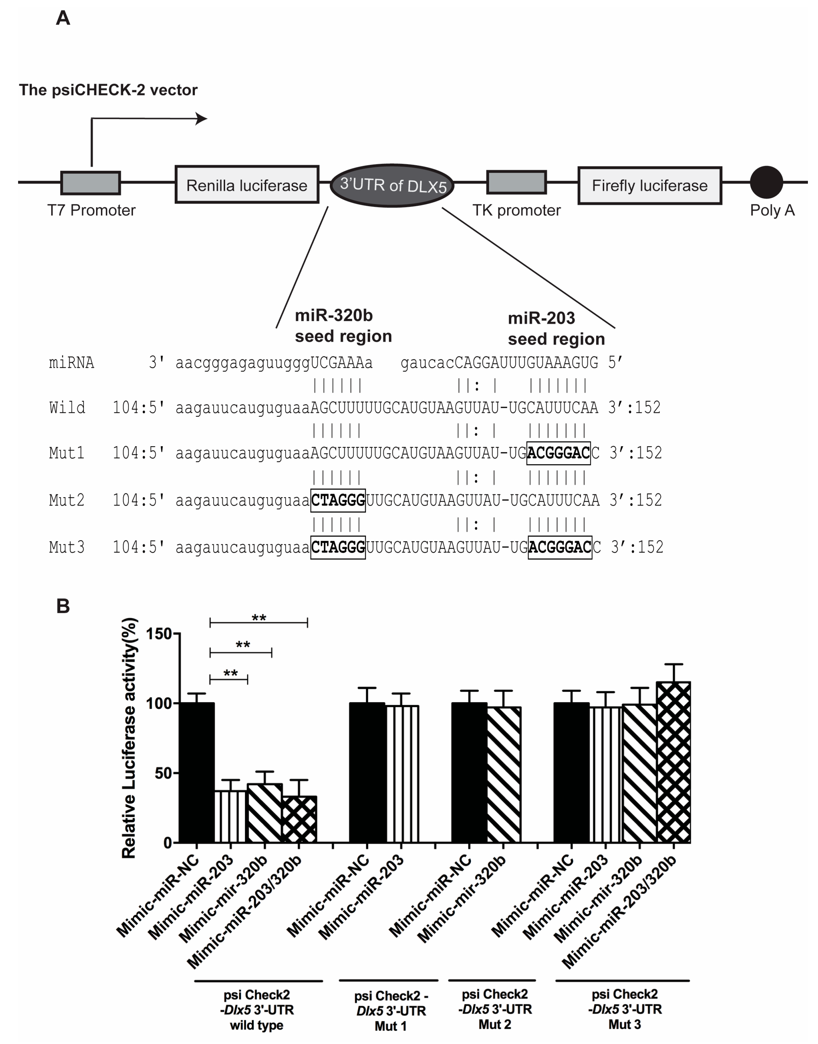 After in silico target prediction as described above, the target region for miR-203 and miR-320 in Dlx5 was verified using Dual-Luciferase Reporter Assay. The psiCHECK-2 vector, a dual-luciferase plasmid, has both the synthetic Firefly Luciferase (Fluc) gene and the synthetic Renilla Luciferase (hRluc) gene incorporated, each possessing its own promoter and poly (A)-addition sites. Luciferase reporter plasmids were constructed by inserting a perfectly complementary (Wild type) 3′ UTR fragment of Dlx5 between the XhoI–NotI restriction sites in the multiple cloning regions in the hRluc gene in the psiCHECK-2 vector (Promega, Madison, WI, USA) by Generay Company (Shanghai, China). We also constructed 3 mutant types by replacing 6–8 base pairs at the 3′-UTR of the seed sequence. DNA sequencing was employed confirming the nucleotide sequences of the constructed plasmids.