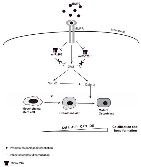 BMP-2 is a highly efficient inducer of osteogenesis, regulating osteoblast differentiation by binding to and thereby stimulating the BMP receptors (BMPR) BMPR-I and BMPR-II. The downstream regulators Smad proteins play an important role in relaying BMP signals from receptors to activate the expression of three osteogenic master transcription factors Dlx5, Runx2 and Osx in the nucleus []. Runx2 in turn regulates the expression of many osteoblastic genes, e.g., Col1A1 (Collagen type I AI), alkaline phosphatase (ALP), Osteopontin (OPN) and osteonectin (ON) [,] (Figure 7). Many bone regulating miRNAs have been recently identified exerting their effects at different stages of osteoblast differentiation when stimulated with BMP-2. Studies show that Smad proteins may bind to miRNA promoter genes and control their transcription and regulate miRNA biogenesis and processing [,,,]. Furthermore, during BMP-2 induced osteogenesis, the expressions of many osteomiRs are downregulated.
