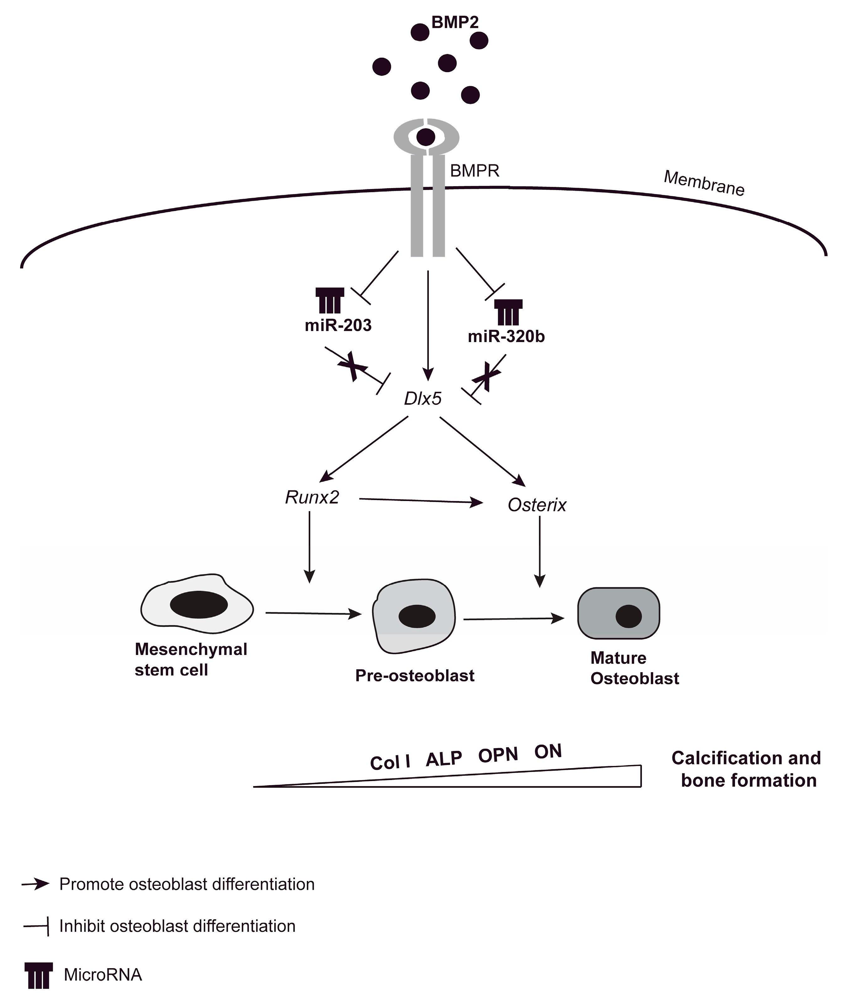 Schematic outline highlighting the complex regulation of BMP-2-induced osteoblastogenesis. BMP-2 binding to the BMP-2 Receptor (BMPR) activates the canonical BMP signaling pathway that regulates osteoblastic differentiation. Our present results suggest that BMP-2 downregulates the expression of miR-203 and miR-320b, in turn upregulating the transcription factor Dlx5 (Distal-less Homeobox 5). Dlx5 up regulation activates both the transcription factors Runx2 and Osx, promoting osteoblast differentiation. This in turn results in the upregulation of genes important for bone formation and calcification, e.g., collagen type I (COL1A1), alkaline phosphatase (ALP), Osteopontin (OPN) and osteonectin (ON).