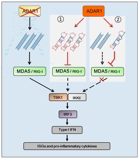 As an IFN-inducible protein, ADAR1 has long been believed to play critical roles in viral infection [,,]. IFN-stimulated response element (ISRE) was found in the promoter region of the ADAR1 P150 isoform, which is responsible for IFN-induced ADAR1 expression [,]. However, until recently, the mechanism by which ADAR1 deficiency activates IFN signaling was not understood. Taking advantage of our inducible ADAR1 KO models [,], we first demonstrated that ADAR1 suppresses IFN signaling by preventing the detection of viral and cellular RNAs by cytosolic RNA receptors []. Deletion of ADAR1 in the cells was shown to dramatically increase type I IFN expression, including IFN-α and IFN-β. It is well established that microbial RNA stimulates type I IFN expression through RNA receptors including the endosome membrane anchored Toll-like receptor 3 (TLR3) [,,] and cytosolic localized RNA receptors, RIG-I-like receptors (RLRs), which include RIG-I (retinoic-acid-inducible protein I) and MDA-5 (melanoma-differentiation-associated gene 5) [,]. After ruling out the involvement of TLR3, we found that downregulation of RIG-I or MDA-5 suppressed the impact of ADAR1 deletion on type I IFN expression []. RLRs detect cytoplasmic dsRNA and lead to activation of the protein kinases TBK1/IKKε through the adaptor protein mitochondrial antiviral-signaling protein (MAVS, also called IFN-β promoter stimulator-1, IPS-1), which in turn phosphorylates IRFs. Phosphorylated IRFs and NFκ-B form dimers and translocate to the nucleus to activate type I IFN gene expression [,,,] (Figure 1). Although our study was more focused on RIG-I, we found that MDA-5 knockdown also blocks the increase in type I IFN production caused by ADAR1 deletion []. This finding was soon confirmed by independent groups and reinforced by evidence from in vivo experiments that genetic deletion of MDA-5 or MAVS rescued the embryonic lethal phenotype of ADAR1 deficiency [,,]. ADAR1−/− embryos could not survive beyond 12.5 d.p.c. [,], but deletion of either the critical adaptor protein MAVS for RNA-sensing signaling or the RNA receptor MDA-5 rescued the embryos to birth, although postnatal death still occurred in some ADAR1 KO mice [,]. As expected, overexpressed ISGs were suppressed in the double KO mice. Collectively, all in vitro and in vivo data strongly support the conclusion that ADAR1 suppresses the cytosolic RNA-sensing signaling in response to endogenous cellular RNA.