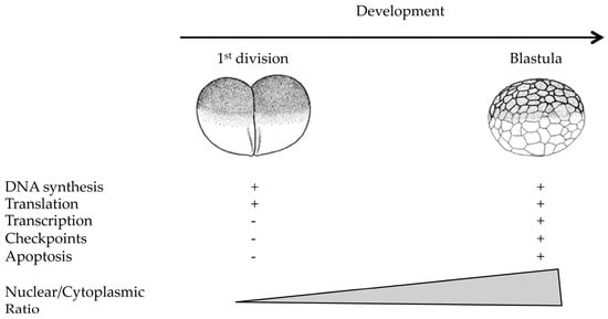 - Conn, C.W.; Lewellyn, A.L.; Maller, J.L. The DNA damage checkpoint in embryonic cell cycles is dependent on the DNA-to-cytoplasmic ratio. Dev. Cell 2004, 7, 275–281. [Google Scholar] [CrossRef] [PubMed]