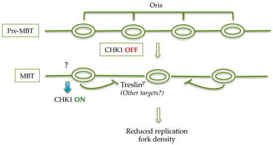Interestingly, Treslin has been very recently reported to be also a substrate of CHK1. Mutation of the Treslin CHK1 binding site stimulated initiation of DNA replication by increasing both the loading of CDC45 onto chromatin and the number of active clusters of replication origins, but did not have an effect on replication fork speed [18,73]. These latter findings put forward Treslin as a target responsible for the checkpoint-mediated reduced fork density observed at the MBT (Figure 3).