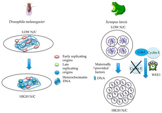 Schematic representation of mechanisms leading to S-phase lengthening at the MBT in Drosophila and Xenopus. In Drosophila, the establishment of heterochromatin, concomitant to the increase in the N/C ratio, contributes to S-phase lengthening after MBT. In Xenopus, titration of maternally inherited factors by the increased N/C ratio and degradation of Cyclin E participate in increasing S-phase length at the MBT. The WEE1 gene is implicated in regulating the timer for MBT onset by acting on the stability of the Cyclin E/CDK2 complex.