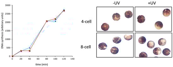 S- and M-phases of early embryos are insensitive to DNA damage. DNA synthesis (left); and images of Xenopus laevis embryos fertilized in vitro (right), cleaving in the absence (blue line and −UV) or presence (red line and +UV) of moderate doses of UV-C irradiation (300 J/m2). Exposure to higher UV doses results in a cell cycle block due to non-specific cross-link of proteins to chromatin and failure to decondense chromosomes.