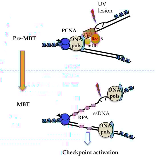 - Kermi, C.; Prieto, S.; van der Laan, S.; Tsanov, N.; Recolin, B.; Uro-Coste, E.; Delisle, M-B.; Maiorano, D. RAD18 is a maternal limiting factor that suppresses the UV-dependent DNA damge checkpoint in Xenopus embryos. Dev. Cell 2015, 34, 364–372. [Google Scholar] [CrossRef] [PubMed]