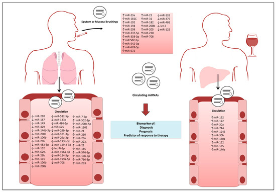 Circulating microRNAs (miRNAs) as early diagnostic biomarkers in tobacco- and alcohol-associated diseases. Circulating miRNAs from blood and sputum or mucosal brushings can be obtained through a minimally invasive technique and have been exploited to assist in the early diagnosis of several diseases.