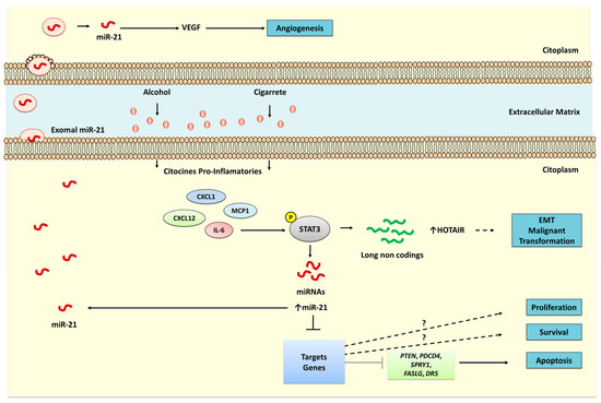 Exposure to tobacco and alcohol modulates the expression of lncRNAs, such as MALAT 1 and HOTAIR, and miRNAs through the IL-6/STAT3 pathway (Figure 2). Liu et al. (2016) [13] and Francis et al. (2014) [9] showed that the regulation of miR-21 in lung and liver cancers is associated with the use of cigarettes and alcohol, respectively, by this pathway. IL-6 phosphorylates and activates STAT3, which in turn activates miR-21 [9,13].