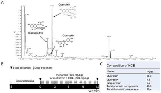 Korean Pharmacopoeia standards of H. cordata were purchased from Dongguk University Ilsan International Hospital (Goyang, Korea). After washing, 500 g of powdered H. cordata was extracted by ethanol (5 L) recycling reflux for 4 h at 70 °C. The extract was filtered through a qualitative filter paper (8 μm pore size, Whatman, Buckinghamshire, UK) and then vacuum lyophilized at −70 °C which eventually produced a yield of 29.1 g (5.82%). In addition, Metformin hydrochloride was obtained from Sigma-Aldrich (St. Louis, MO, USA).