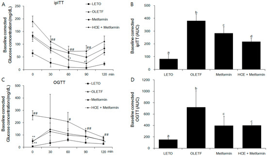 Impact of metformin either alone or in combination with HCE on the insulin sensitivity and glucose tolerance in OLETF rats. (A) Intraperitoneal insulin tolerance test (ipITT) and (C) oral glucose tolerance test (OGTT) were conducted on the animals at the last week of treatment schedule and the corresponding baseline corrected areas under the curves (AUCs) (B,D respectively) were constructed as described in the Materials and Methods section. # p < 0.05, ## p < 0.01 compared to LETO group; * p < 0.05, ** p < 0.01 compared to the OLETF group, as analyzed by one way ANOVA test. Data in bar diagrams with different letters are significantly different (p < 0.05) according to one way ANOVA analysis.
