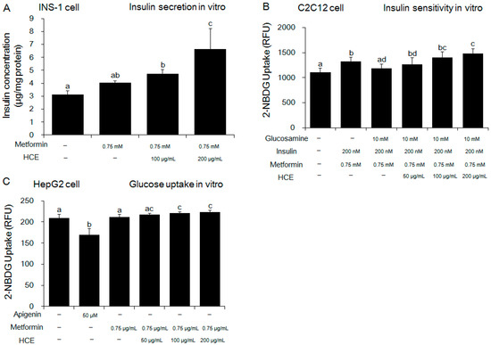 Effect of metformin either alone or in combination with HCE on the in vitro insulin secretion, insulin sensitivity, and glucose uptake. (A) Insulin secretion, (B) insulin sensitivity and (C) glucose uptake were measured using INS-1 (an insulin-secreting cell line), C2C12 (an immortalized mouse myoblast cell line), and HepG2 (a human liver cancer cell line) cells, respectively as mentioned in the Materials and Methods section. Data with different letters are significantly different (p < 0.05) according to one way ANOVA analysis.