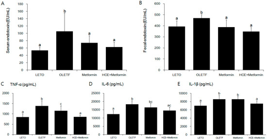 Effect of metformin either alone or in combination with HCE on the serum and fecal endotoxin levels (A,B respectively); and the vital serum proinflammatory cytokines (C–E) in OLETF rats. Data with different letters are significantly different (p < 0.05) according to one way ANOVA analysis. IL-6, interleukin 6; TNF-α, tumor necrosis factor alfa.