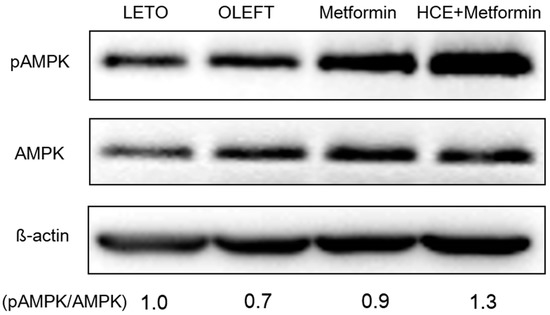 Treatment of OLETF rats with metformin triggers the phosphorylation of hepatic AMPKα at Thr172 position resulting in the activation of AMPK. Exposure of metformin-treated rats to HCE resulted in a marked enhancement in AMPK phosphorylation (Figure 5).