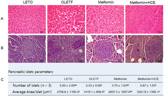 Effect of metformin either alone or in combination with HCE on the histological architecture of the liver and pancreas, and the abundance of pancreatic islets in OLETF rats. At the termination of the experimental period, the liver (A) and pancreas (B) were excised rapidly following which tissue sections were prepared and stained with hematoxylin. The histological examination of the tissue sections was performed under a light microscope (200× magnification). Number of pancreatic islets and average area/islet are shown (C). Data with different letters are significantly different (p < 0.05) according to one way ANOVA analysis.