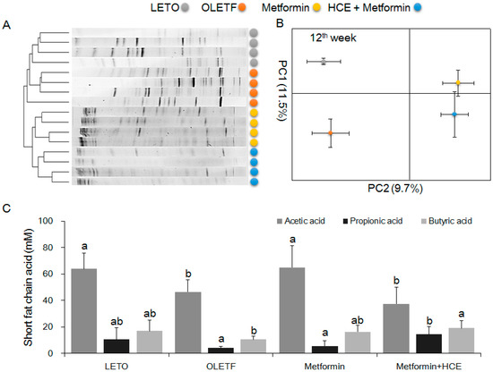 Impact of metformin either alone or in combination with HCE on the gut microbial population and the abundance of short chain fatty acids in the stool of OLETF rats. (A) The microbial communities in the fecal samples were analyzed by PCR-denaturing gradient gel electrophoresis (DGGE) as described in the Materials and Methods section; (B) Principal component analysis (PCA) of the data was performed based on distance matrix (two-dimensional array) for the evaluation of similarity between bacterial communities; (C) The levels of fecal acetic acid, propionic acid, and butyric acid are shown. Data with different letters are significantly different (p < 0.05) according to one way ANOVA analysis.