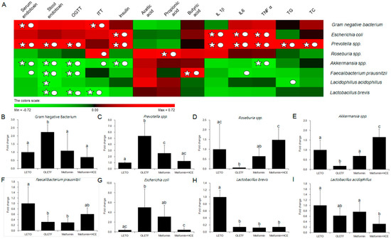 Relative abundance of gut microbiota and correlation between gut microbial relative abundance and host parameters. (A) The correlation analysis was performed using two-tailed Pearson’s correlation test and diagramed by PermuMatrix software (version 1.9.3 EN) using heatmap plots; (B–I) R value greater than 0.4 indicates a positive correlation (red color), while r value less than −0.4 indicates a negative correlation (green color). A symbol of ○ indicates value of Pearson r > 0.4 or r < −0.4 and a symbol of ☆ indicates statistical significance of p value less than 0.05. The relative abundance of the 16S rRNA gene of the gut bacteria in stool samples was determined using real-time PCR as described in the Materials and Methods section. The results are expressed as normalized fold values relative to the normal group. Data are expressed as the mean ± SD (n = 7). Data with different letters are significantly different (p < 0.05) according to one way ANOVA analysis.